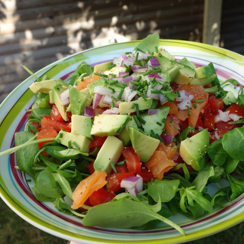 Salade, tomates, saumon fumé, crevettes, avocat, ciboulette fraîches