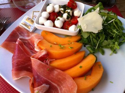 Melon, jambon cru, salade, copeaux de parmesan et tomates (saison)