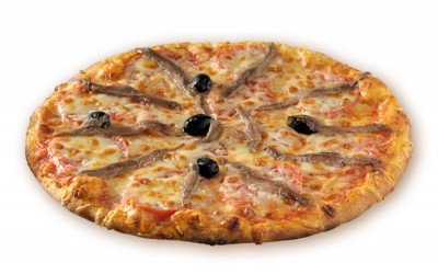 Sauce tomate, mozzarella, anchois, câpres, olives, origan