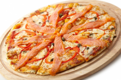 Tomato sauce, smoked salmon, crème fraîche, mozzarella, chives
