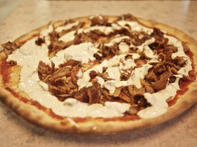 Sauce tomate, poulet façon kebab (Halal), tomate fraîche, mozzarella, oignons, sauce blanche